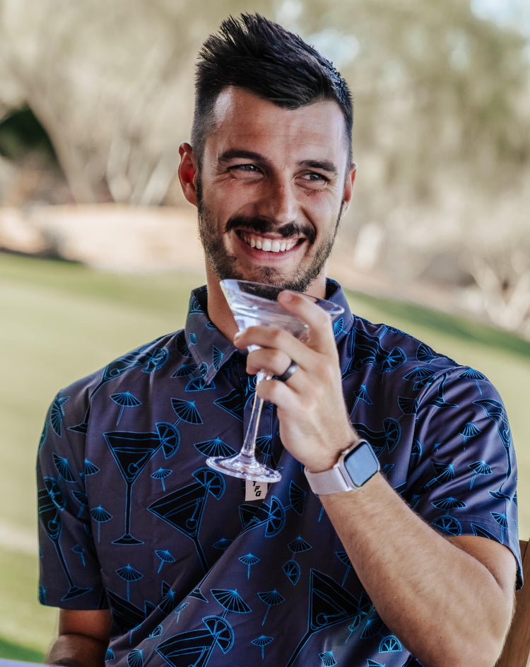 Dressed in the Blue Martini Golf Polo, you'll exude an air of confident allure that is second to none. The captivating martini glass pattern reflects your love for celebration and the finer things in life, making a statement that goes beyond style – it's a celebration of your passion for both golf and life's pleasures.